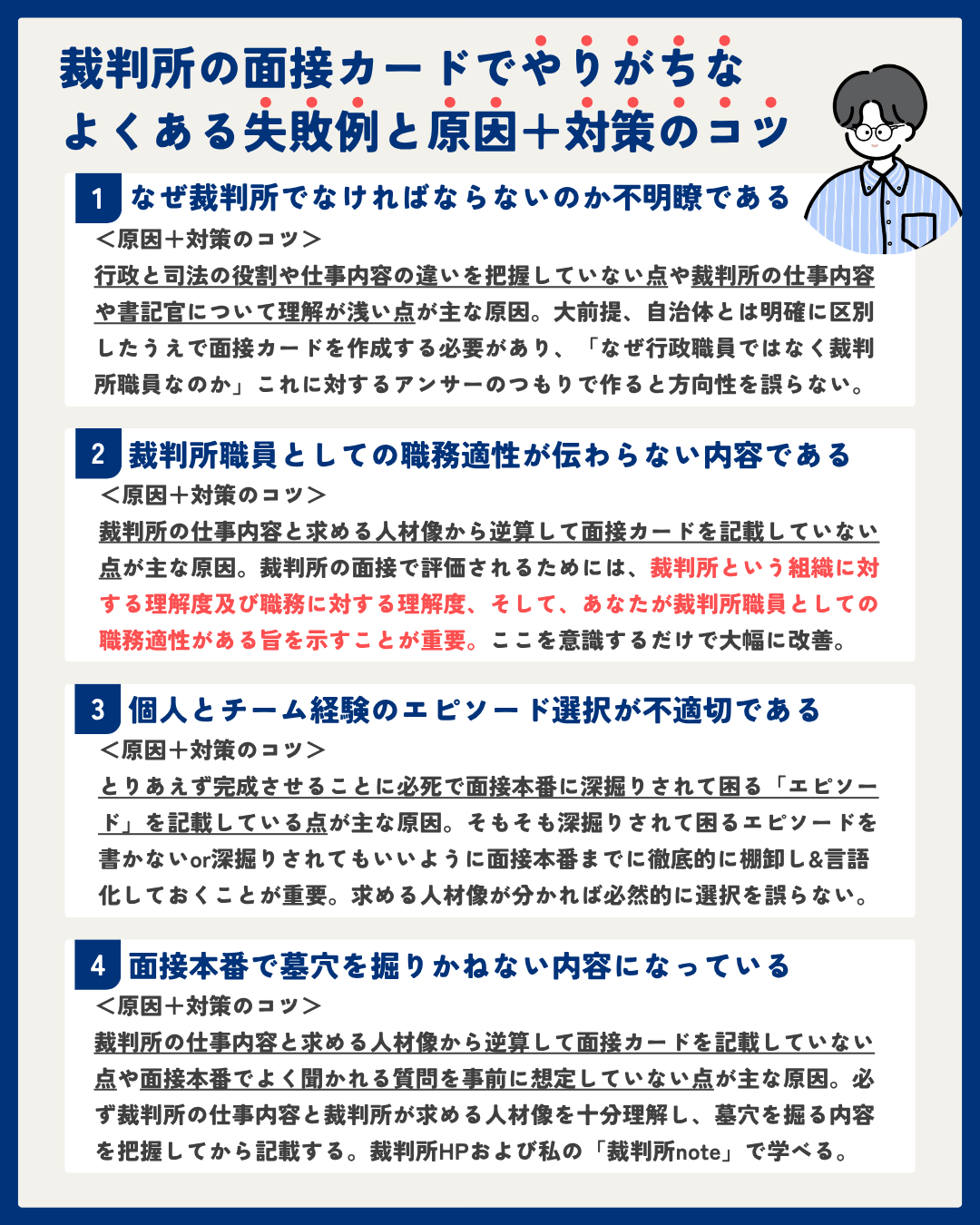 次に、裁判所の面接カードで受験生がやりがちなよくある失敗例について以下の図解に基づいて解説します。