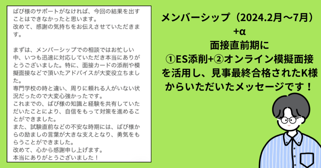 私は、これまで合計100名以上のES添削や受験指導を行い、数多くの合格者を輩出してきたいわば人物試験対策のプロです。