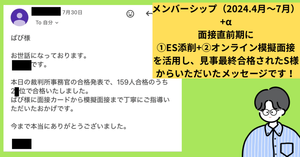 ただし、これまで総合職および家庭裁判所調査官を志望する方の「面接カードの添削」や「個別相談」を受けて、添削およびアドバイスをした方が最終合格したという実績はあります。